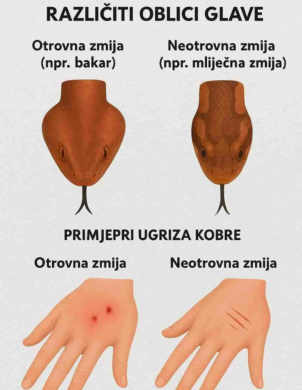 Ne oslanjajte se samo na oblik glave, jer neke bezopasne vrste imitiraju opasne. Uvijek se obratite ljekaru ako sumnjate na ugriz otrovnice.