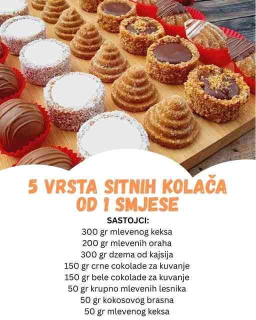 Ako ste u potrazi za brzim i jednostavnim načinom pripreme više vrsta kolača, ovaj recept je pravi izbor za vas. Kombinacija mljevenog keksamljevenih orahadžema od kajsija i nekoliko osnovnih sastojaka kao što su čokoladakokosovo brašno i lješnjaci stvara bogatstvo okusa i tekstura. Svaka od ovih poslastica nudi nešto posebno – od hrskavih korpica, preko sočnih valjaka, pa sve do bombica koje se tope u ustima.