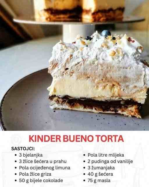 Ova torta se izdvaja po dvobojnoj kremi, koja se pravi iz jedne baze, ali se deli na dve polovine – jedna se obogaćuje belom čokoladom, a druga tamnom. Time se postiže savršen balans ukusa koji podseća na pravu Kinder Bueno čokoladicu.