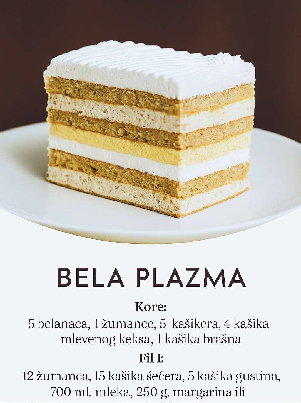 Bela Plazma torta je lagana, kremasta poslastica sa korama od keksa i bogatim filovima,