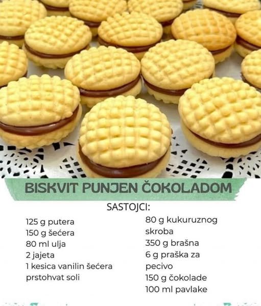Priprema: Umutite puter sa šećerom, pa dodajte ulje i promešajte. Zatim dodajte jaja, vanilin šećer, prstohvat soli i skrob. Dobro sjedinite, pa sipajte prosejano brašno sa praškom za pecivo. Umesite testo. Odvajajte po malo testa i oblikujte loptice. Ako imate neku rešetku pritisnite lopticu, kako bi ostala šara. Ako nemate samo je malo spljoštite između ruku. Poređajte na pleh obložen pek papirom. Pecite ih u zagrejanoj rerni na 170°C oko 20 minuta. Čokoladu istopite sa slatkom pavlakom, pa premažite jednu poluloptu od testa i preklopite drugom.