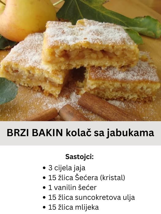Podijelite na dva djela, prvi dio ulijte u (manji 20 x 25 cm) kalup za pečenje prethodno premazan s uljem, pecite 15-ak minuta na 180 stupnjeva, za to vrijeme ogulite, naribajte jabuke, prelijte sokom od limuna (da ne potamne, dok čekaju) i dodajte cimet po ukusu.