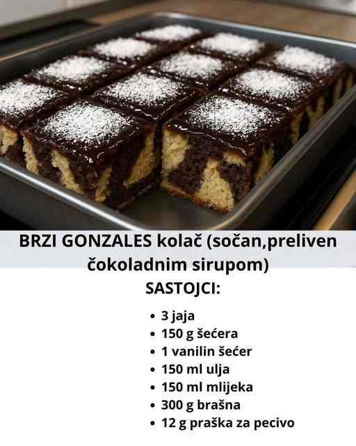 Brzi Gonzales je jedan od onih kolača koji se prave „iz rukava“ – bez komplikacija i dugačkog mućenja, a rezultat je mekan, sočan i predivno čokoladan kolač koji se preliva vrućim prelivom. Idealno za kada želite nešto brzo, jednostavno, a efektnog ukusa! Peče se kratko, sastojci su osnovni, i uvek ispadne savršeno. Ovaj recept je originalno delila J. Nermina i postao je pravi hit među ljubiteljima brzih kolača.