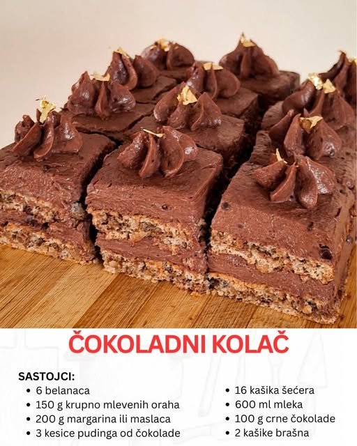 Čokoladni kolač je klasik među poslasticama i pravi primer kako se od jednostavnih sastojaka može stvoriti pravo malo remek-delo. Spoj lagane kore sa orasima i rendanom čokoladom sa kremastim filom od pudinga i maslaca daje desert koji nikoga neće ostaviti ravnodušnim.još ukusniji.