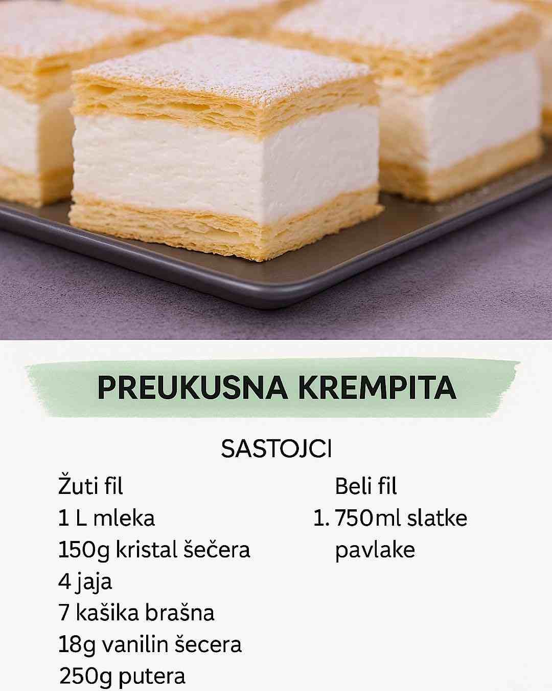 Recept koji zaslužuje pažnju! Na veoma lagan način dobićete prelepu poslasticu sa kojom će svi biti više nego prezadovoljni. Priprema krempite je relativno jednostavna a sastojci se mogu naći u gotovo svakom domaćinstvu, što je jedan od razloga zbog velike popularnosti ove poslastice. Neodoljivo kremasta – jedinstvena krempita najviše će obradovati klince a i nas koji obožavamo ovako prelepe poslastice.