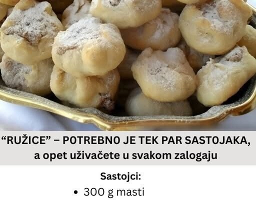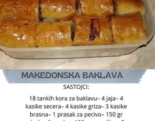 Sastojci – 18 tankih kora za baklavu– 4 jaja– 4 kasike secera– 4 kasike griza– 3 kasike brasna– 1 prasak za pecivo– 150 gr sjeckanih oraha– 100 gr grozdjica– 2 kisele jabuke– 3 dcl ulja. Zaliv:– 600 gr secera– 0,5 l vode– 1 vanilin secer Priprema Zicom umutiti jaja i secer, zatim dodati griz,…