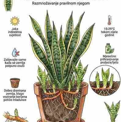 Idealni uvjeti za rast i razmnožavanje Sanseverija, poznata i kao snake plant, proizvodi mnogo mladih izdanaka ili “pupova” kada se pravilno njeguje i kada se oponašaju njeni prirodni uslovi rasta. Svjetlost: Postavite biljku na svijetlo mjesto s indirektnom svjetlošću, idealno pored istočnog ili zapadnog prozora. Iako tolerira slabo svjetlo, u svijetlijim uvjetima raste brže i…