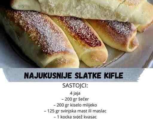 Najbolji recepti! Slatke, mekane kifle za 15 minuta. Sastojci: – 4 jaja – 200 gr šečer – 200 gr kiselo mlijeko – 125 gr svinjska mast ili maslac – 1 kocka svjež kvasac – 1 žličica soli – kora naribana od 1 limuna – 1 Vanilin šećer Dolcela – 125 ml mlačnog mlijeka – 50 ml mlijeka…