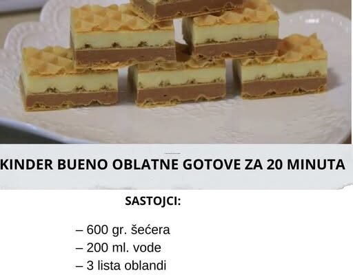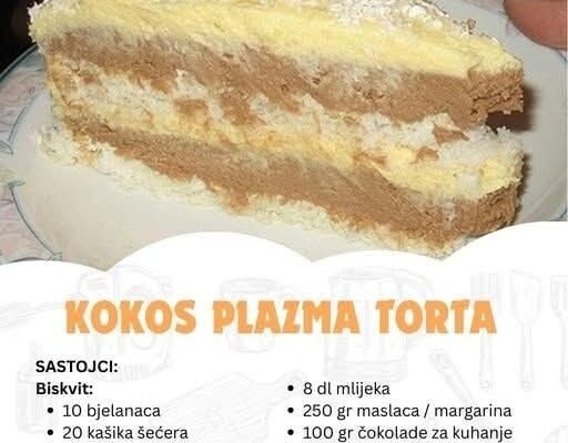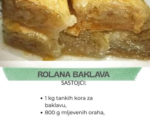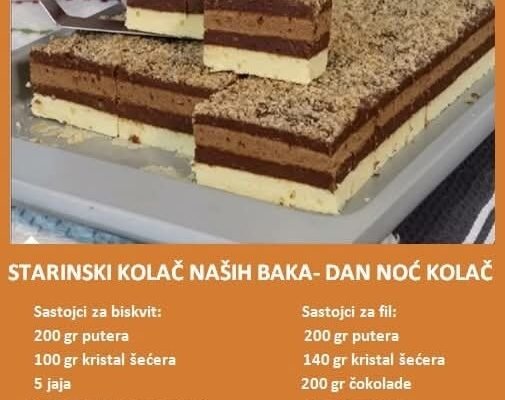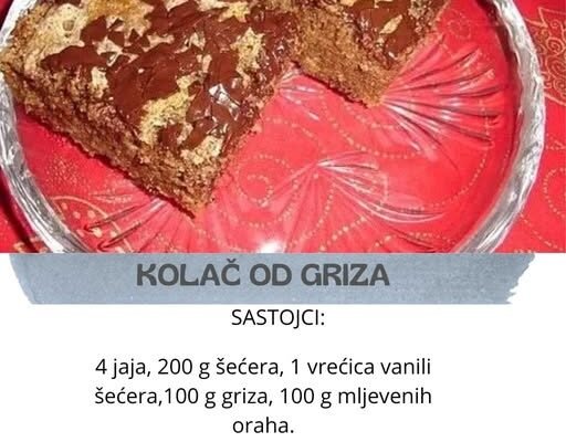 Sastojci – 4 jaja– 200 g šećera– 1 vrećica vanili šećera– 100 g griza– 100 g mljevenih oraha.Za preljevanje:– 500 ml mlijeka– 1 mahuna vanilije– 3 žlice šećera.Za ukras:– 50 g tamne čokolade. Cijela jaja miješati sa šećerom i vanili šećerom, potom dodati griz i orahe. Izliti u namašten i pobrašnjen pleh, te staviti peći u prethodno…