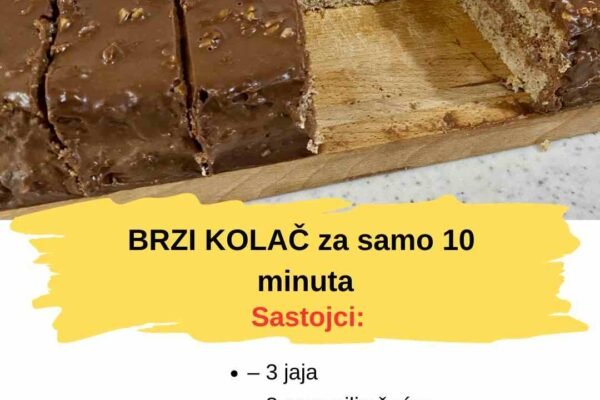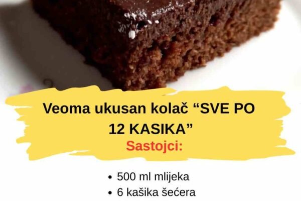 Brzi sočni kolač od kokosa sve po 12 kašika Recept: 3 jaja 12 kašika šećera 12 kašika ulja 12 kašika mlijeka vanilin šećer 12 kasika brašna 1 prašak za pecivo 2 kasike kakao u prahu 3 kašike kokosa (ukupno koristite 100 gr kokosa za ovaj kolač) Preliv: 500 ml mlijeka 6 kašika šećera 3 kasike…