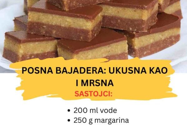 POSNA BAJADERA: Podjednako ukusna kao i mrsna – topi se u ustima. Bajadera je bez sumnje jedna od naših najpoznatijih slastica koju vole gotovo svi. Najpoznatija je njezina kupovna varijanta, no postoji i prava domaća koja je po meni daleko bolja, te se s punim pravom može nazvati jednim od najboljih stolnih kolačića koji je…
