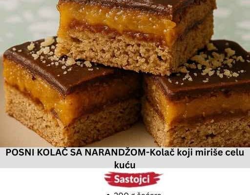 SASTOJCI Za koru: 450 g brašna 70 ml ulja 350 ml mineralne vode 1 zamrznuta narandža bez kore (izrendati celu) 200 g šećera 1 kašika sode bikarbone Za fil: 200 g šećera 100 ml vode 1 kesica vanilin šećera 100 g mlevenih oraha 100 g mlevenog posnog keksa 80 g margarina 1 zamrznuta narandža bez…