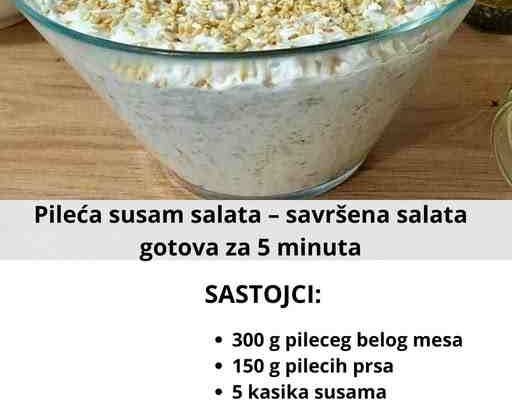 Pileća susam salata je salata koja se zaista brzo sprema, može da stoji par dana, savršenog je ukusa i možete je jesti kao salatu ili kao namaz na hlebu. Odlična je i za svaki dan kada ne znate šta biste jeli za doručak ili večeru, a super je ideja i za prazničnu trpezu. Sastojci: 300…