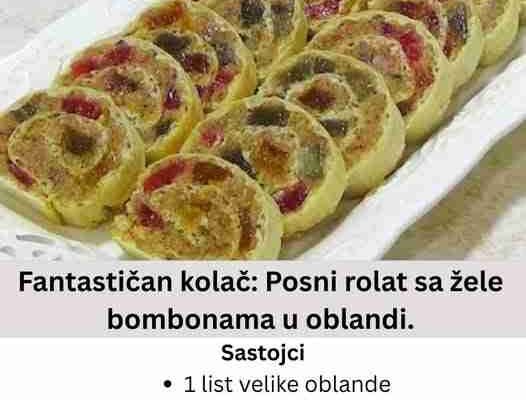 Posni rolat sa žele bombonama u oblandi. Sastojci: 1 list velike oblande 1 dl vode 100 g šećera 100 g posnog margarina 100 g mlevenih oraha 100 g posnog mlevenog keksa 300 g žele bombona Priprema: List oblande umotati u vlažnu krpu i ostaviti da omekani. Vodu i šećer kuvati dok ne provri. Dodati margarin…