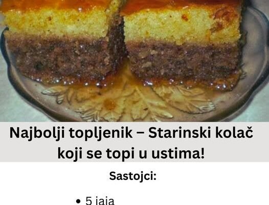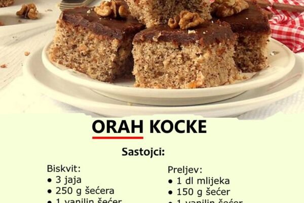 Ukusan kolač koji će obradovati ljubitelje klasičnih slastica. Sastojci: Biskvit: ● 3 jaja ● 250 g šećera ● 1 vanilin šećer ● 200 ml ulje ● 300 ml mlijeko ● 250 g brašna ● 1 prašak za pecivo ● 150 g oraha ● žlica ruma ● limunova korica Preljev: ● 1 dl mlijeka ● 150…
