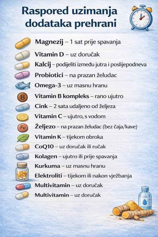Važno je naglasiti da se učinkovitost dodatka prehrani ne temelji samo na njihovom sastavu, već i na tome kako i kada se uzimaju, što je jasno prikazano i u pratećoj infografici.