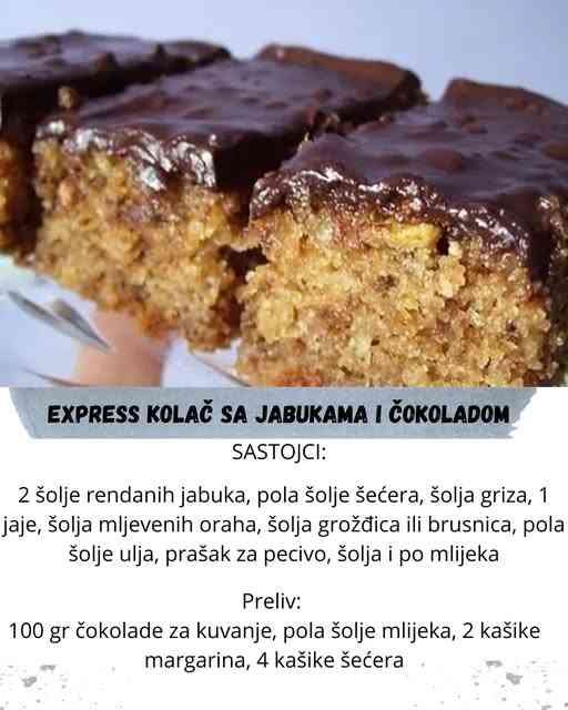 2 šolje rendanih jabuka– pola šolje šećera– šolja griza– 1 jaje– šolja mljevenih oraha– šolja grožđica ili brusnica– pola šolje ulja– prašak za pecivo– šolja i po mlijeka