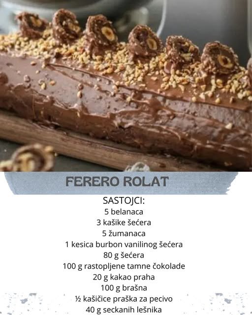 Da li lešnika i čokolade ikako i ikada može biti dosta? Ferero rolat! Spoj mekanog biskvita, hrskavih lešnika i neodoljivog krema! Ne postoji ni jedan razlog da ga ne napravite prvom sledećom prilikom.