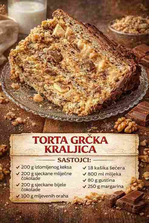 Grčka kraljica torta je pravi primjer kako jednostavni sastojci mogu stvoriti raskošan desert. Inspirisana mediteranskom kuhinjom, ova torta donosi bogatstvo ukusa kroz savršen spoj oraha, čokolade i nježne kreme. Već na prvi pogled djeluje elegantno i primamljivo, a njen okus nadmašuje sva očekivanja. Idealan je izbor za posebne prilike kada želite impresionirati goste nečim drugačijim, ali i domaćim.