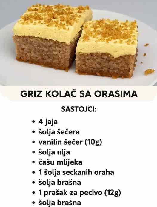 Postoje kolači koji osvoje na prvi zalogaj, a opet se prave nevjerovatno brzo i jednostavno. Upravo takav je recept sa grizom i orasima – spoj tradicije i sočne slastice koja nikoga ne ostavlja ravnodušnim.