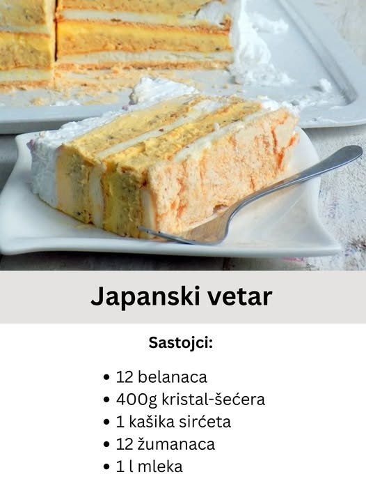 Japanski vetar je torta koja savršeno kombinuje laganu hrskavu koru, bogat i kremast fil i nežan sloj šlaga. Ovaj desert je jednostavan za pripremu, ali zahteva pažnju i preciznost kako bi svaki sloj bio savršeno pripremljen. Sa svojom bogatom teksturom i sofisticiranim ukusima, Japanski vetar je idealan za sve proslave, ali i za svakodnevne užitke.