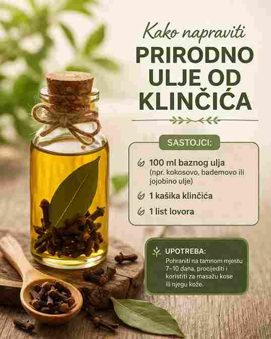 Ulje klinčića je poznato po svojoj toploj aromi i mnogim tradicionalnim svojstvima u prirodnoj njezi tijela i zdravlju. Koristi se za masažu, njegu kože i kose, te za olakšavanje manjih bolova i upala. Priprema ovog ulja kod kuće je jednostavna i jeftina, a omogućava vam da dobijete potpuno prirodan proizvod bez hemikalija.