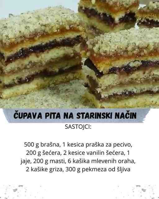 500 g brašna, 1 kesica praška za pecivo, 200 g šećera, 2 kesice vanilin šećera, 1 jaje, 200 g masti, 6 kašika mlevenih oraha, 2 kašike griza, 300 g pekmeza od šljiva