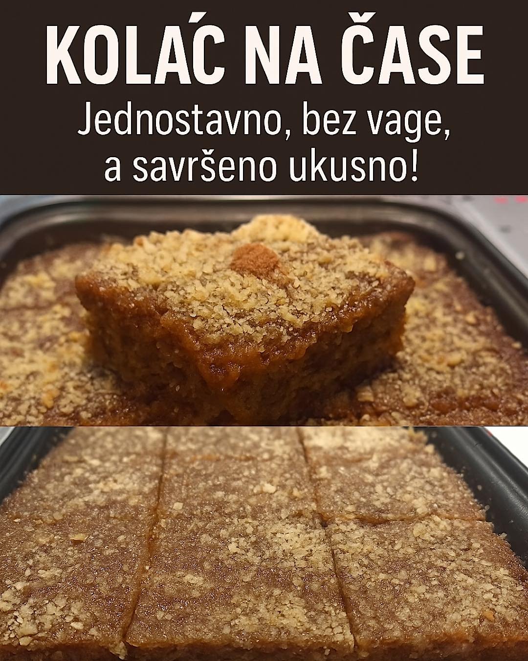 Ovaj brz,starinski kolac izuzetnog ukusa mozete napraviti od sastojaka koje uglavnom imate.Umesto seckanih oraha mozete ubaciti suvo grozdje ili neko drugo suvo voce.Mozete posuti orasima ili kokosom.I mlevena cokolada se odlicno slaze sa ukusima.