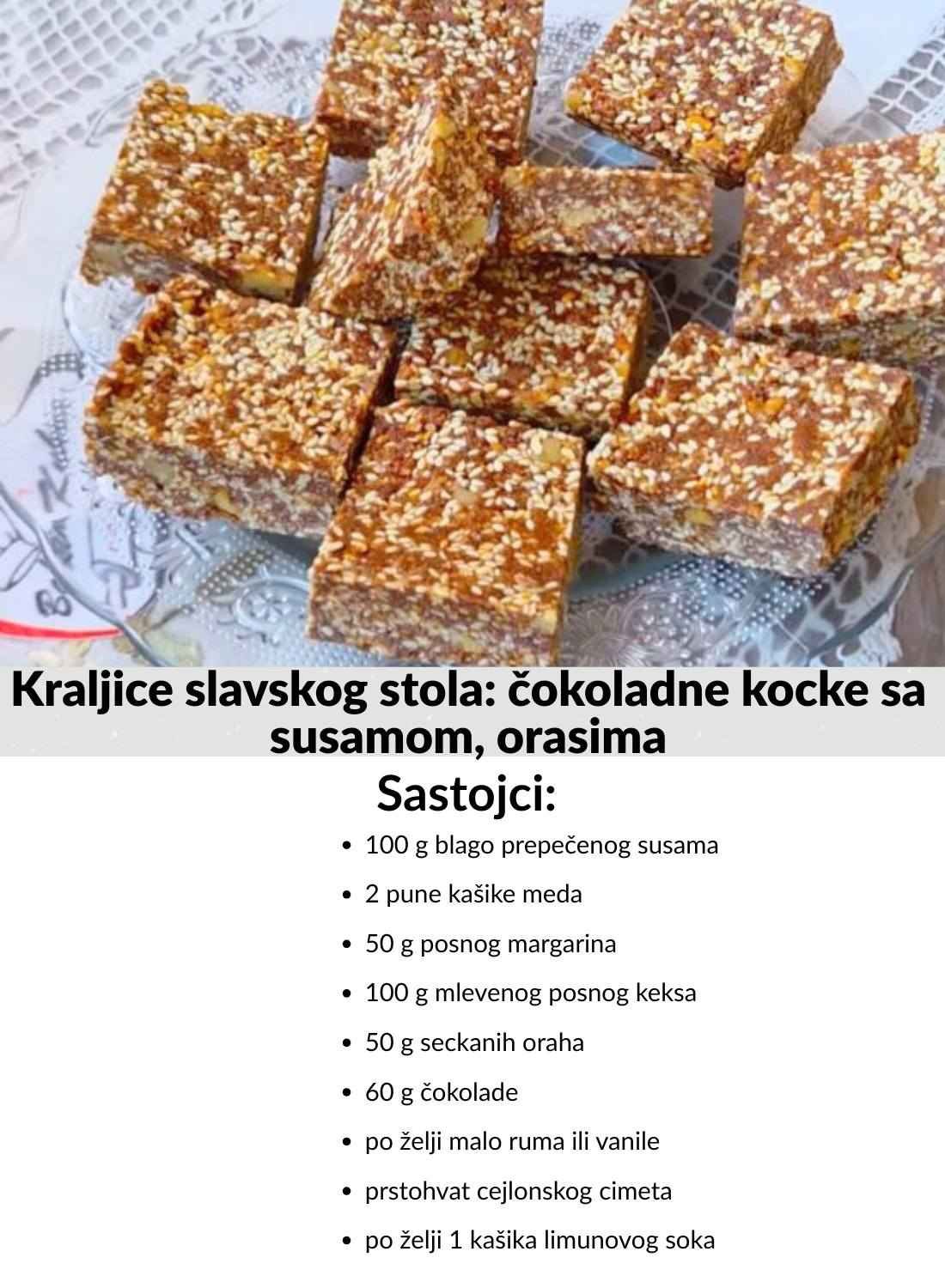 Ove čokoladne posne kocke sa susamom, orasima i cimetom s pravom nose titulu kraljica slavskog stola. Bez pečenja, bogate aromom i elegantnim izgledom, uvek oduševe goste i prve nestanu sa tacne.