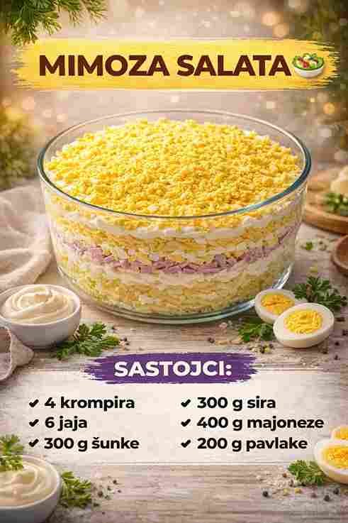 Mimoza salata je jedan od onih klasičnih recepata koji nikada ne izlaze iz mode. Kremasta, slojevita i bogatog ukusa, savršeno se uklapa u svečane prilike, porodične ručkove i praznične trpeze. Njena posebnost je u jednostavnim sastojcima koji zajedno stvaraju nevjerovatno ukusan spoj.