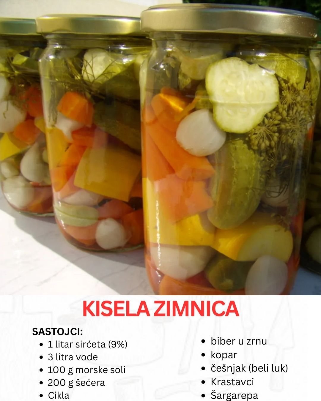 Kada nastupi jesen, domaćice širom naših krajeva počinju sa pripremom zimnice – pravom riznicom ukusa i boja koja obezbeđuje da i tokom hladnih meseci možemo uživati u bogatstvu povrća. Jedan od najvažnijih i najcenjenijih recepata je upravo kisela zimnica. Ovaj način pripreme i čuvanja povrća ne samo da produžava njegovu trajnost, već i oplemenjuje ukuse, dajući im osvežavajuću i kiselkastu notu.