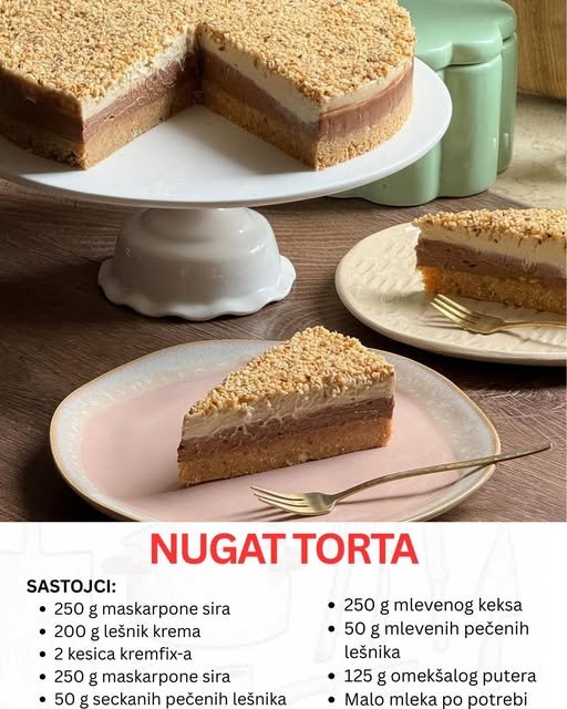 Nugat torta je pravi primer kako se od nekoliko pažljivo odabranih sastojaka može napraviti desert koji oduzima dah. Kroz kombinaciju mekane i kremaste teksture, hrskavih detalja i intenzivne arome lešnika, ovaj kolač postaje favorit u svakoj porodici. Prijatno i uživajte!