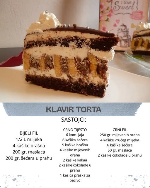 Od bjelanjaka umutiti snijeg sa šećerom. Dodati žumanjke, zatim brašno, mljevene orahe, kakao i čokoladu u prahu. Peći u pobrašnjenoj i podmazanoj tepsiji (veličina 26).