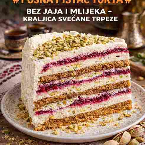 Posna pistać torta je prava kraljica svečanog stola – sočna, kremasta i bogata ukusom, a potpuno bez jaja i mleka. Ova torta je idealna za praznike, rođendane ili posebne prilike kada želite impresionirati goste sa posnom, ali luksuznom poslasticom. Bogat ukus pistaća u kombinaciji sa glatkim kremom čini svaki zalogaj nezaboravnim.