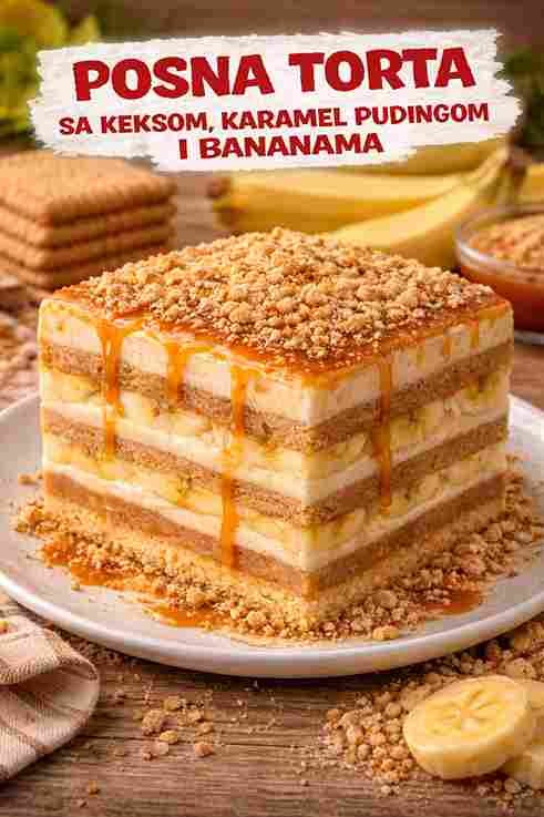 Posna torta sa keksom, karamel pudingom i bananama je savršen desert za sve koji žele nešto slatko, a potpuno posno. Ova torta je kremasta, sočna i mirisna, sa savršenom kombinacijom hrskavog keksa, glatkog karamel pudinga i svježih banana. Idealan je izbor za praznike, rođendane ili bilo koju posebnu priliku.