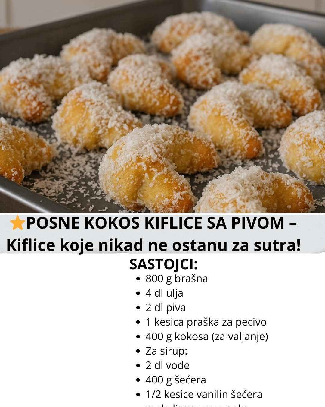 Mirisne, mekane i fina kokosa, a testo se sprema tako lako da ih možete praviti i usred najprometnijeg dana. Pivo u testu daje posebnu mekoću i hrskav spoljašnji sloj, dok je kokos dodatak koji sve podigne na viši nivo. Ove kiflice su idealne za slavsku trpezu, posluženje uz čaj ili kao posni desert koji uvek nestane prvi.