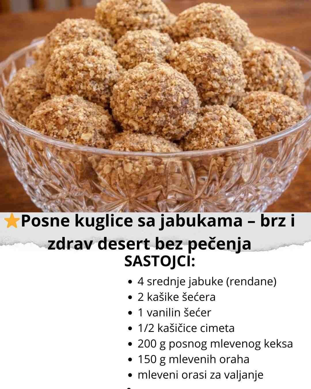 Posne kuglice sa jabukama su savršen izbor kada želite lagan, domaći i ukusan desert bez pečenja. Prave se brzo, od jednostavnih sastojaka, a zahvaljujući jabukama i orasima imaju prirodnu sočnost i prijatan, blago kiselkast ukus.