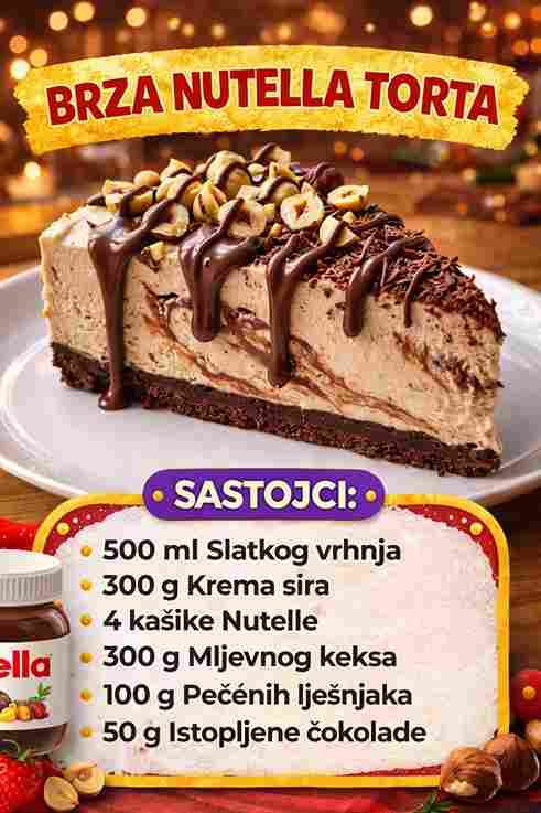 Ova brza Nutella torta bez pečenja idealna je kada želiš nešto slatko bez puno truda. Kombinacija čokolade i lješnjaka daje savršen balans ukusa, a jednostavna priprema čini je savršenim desertom za svaku priliku.