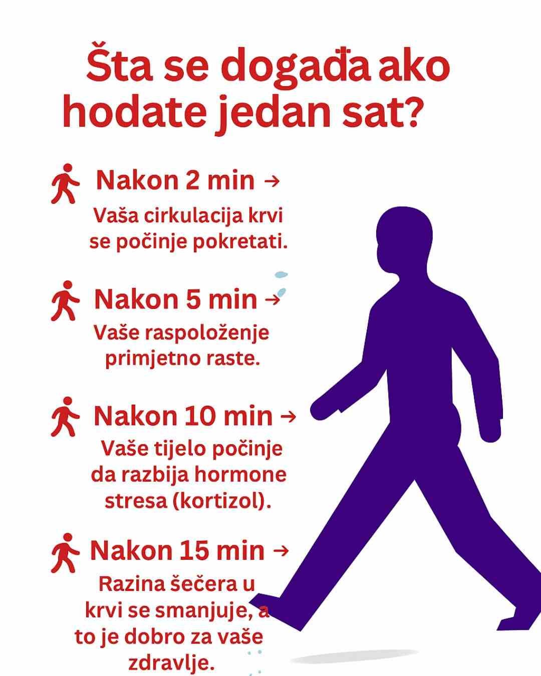 Redovna šetnja od samo jednog sata dnevno donosi brojne koristi za tijelo i um. Iako djeluje jednostavno, svaki minut tokom šetnje aktivira različite procese u našem organizmu koji poboljšavaju zdravlje, raspoloženje i kvalitet života. Evo šta se dešava korak po korak: