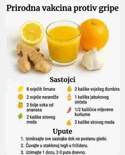 U sezoni prehlada i gripa, prirodni napitci mogu pomoći tijelu da se održi snažnim i otpornim. Ovaj moćni “flu shot” kombinuje citrus, đumbir, kurkumu i med, sastojke koji se tradicionalno koriste za jačanje imuniteta, podršku probavi i opće blagostanje. Redovna konzumacija može pomoći tijelu da bolje reaguje na sezonske infekcije.