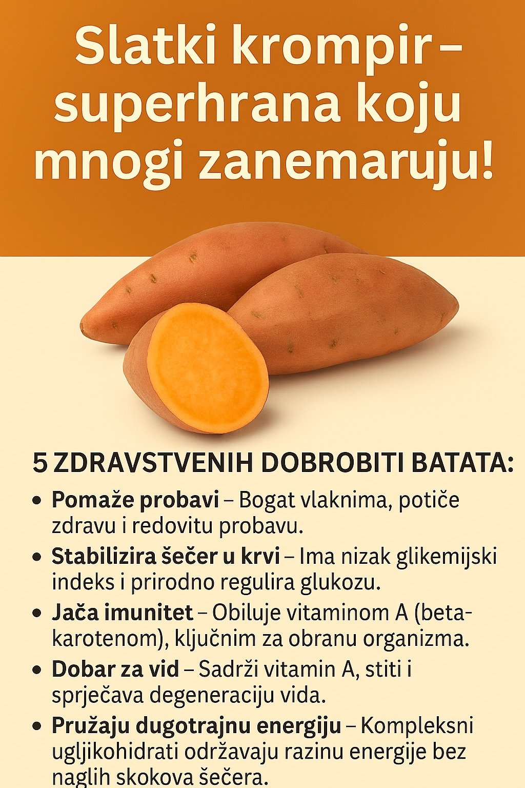 Batat je izvrstan izvor vitamina, minerala i vlakana, što znači da doprinosi zdravlju probave.