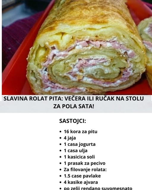 Kad izvadite iz rerne, prekrijte pleh sa korom mokrom krpom, da krajevi malo omeknu, da mozete da je urolate, i tako jos u plehu, kako se ona hladi, motajte u rolat koru, pa razmotajte i premazite pavlakom i rendanim suvomesnatim po zelji, a ja sam stavila ajvar, sad mu je vreme.