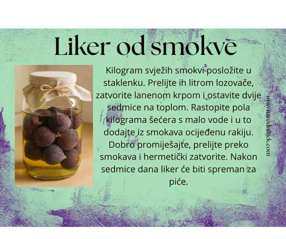 Kilogram svježih smokvi poslažite u staklenku. Prelijte ih litrom lozovače, zatvorite lanenom krpom i ostavite dvije sedmice na toplom. Rastopite pola kilograma šećera s malo vode i u to dodajte iz smokava ocijeđenu rakiju. Dobro promiješajte, prelijte preko smokava i hermetički zatvorite. Nakon sedmice dana liker će biti spreman za piće.