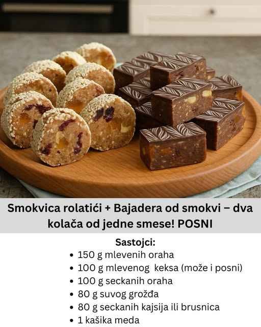 Jedna smesa – dva fenomenalna kolača: zdravi, mirisni, puni suhog voća i orašastih plodova. Bez pečenja, savršeni za slavsku trpezu, poklone ili zdravu poslasticu uz kafu!