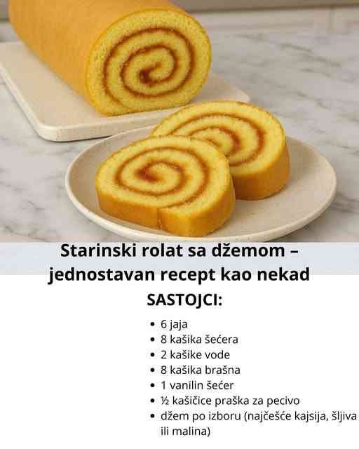 Ako volite mekane, mirisne  kolače iz detinjstva, onda je ovaj starinski rolat sa  džemom pravi izbor za vas. Lagan, sočan i nežan, ovaj rolat se pravi od nekoliko osnovnih sastojaka koje svi imamo kod kuće. Savršen je uz šolju kafe ili čaja, a još lepši kada se posluži posut prah šećerom.
