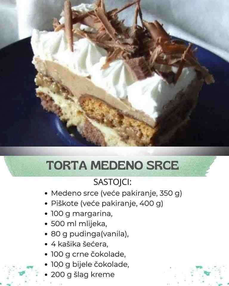 Preko njih stavimo bijeli fil, pa poredamo medena srca koja smo prethodno na dva tri mjesta izbockali viljuškom i provlačili kroz sok.
