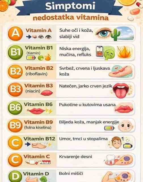 Vitamini su esencijalni nutrijenti koji igraju vitalnu ulogu u održavanju cjelokupnog zdravlja i pravilnog funkcioniranja ljudskog tijela. Oni podržavaju važne procese kao što su vid, zdravlje kože, snaga mišića, funkcija živaca, stvaranje krvi i imunološki sistem. Kada tijelo ne prima dovoljno vitamina putem prehrane ili sunčeve svjetlosti, to može dovesti do nedostatka vitamina. Ovi nedostaci često pokazuju vidljive znakove koje ne treba zanemariti.