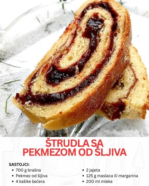 Štrudla sa pekmezom od šljiva nije samo kolač — to je ukus tradicije, miris koji vraća u detinjstvo i podseća na porodična okupljanja. Ovaj recept spaja jednostavne sastojke u remek-delo domaće kuhinje, a svako ko ga proba osetiće da se u svaku krišku utkala ljubav i strpljenje onoga ko ju je pravio.