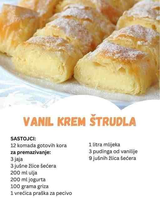Vanil krem štrudla je pravi izbor za sve ljubitelje jednostavnih, ali ukusnih poslastica. Ovaj kolač, pripremljen od gotovih kora, sa bogatim vanilin kremom i prefinjenim filom, pruža nezaboravan užitak. Idealna je za sve prilike: od porodičnih okupljanja do uživanja u popodnevnoj kafi.