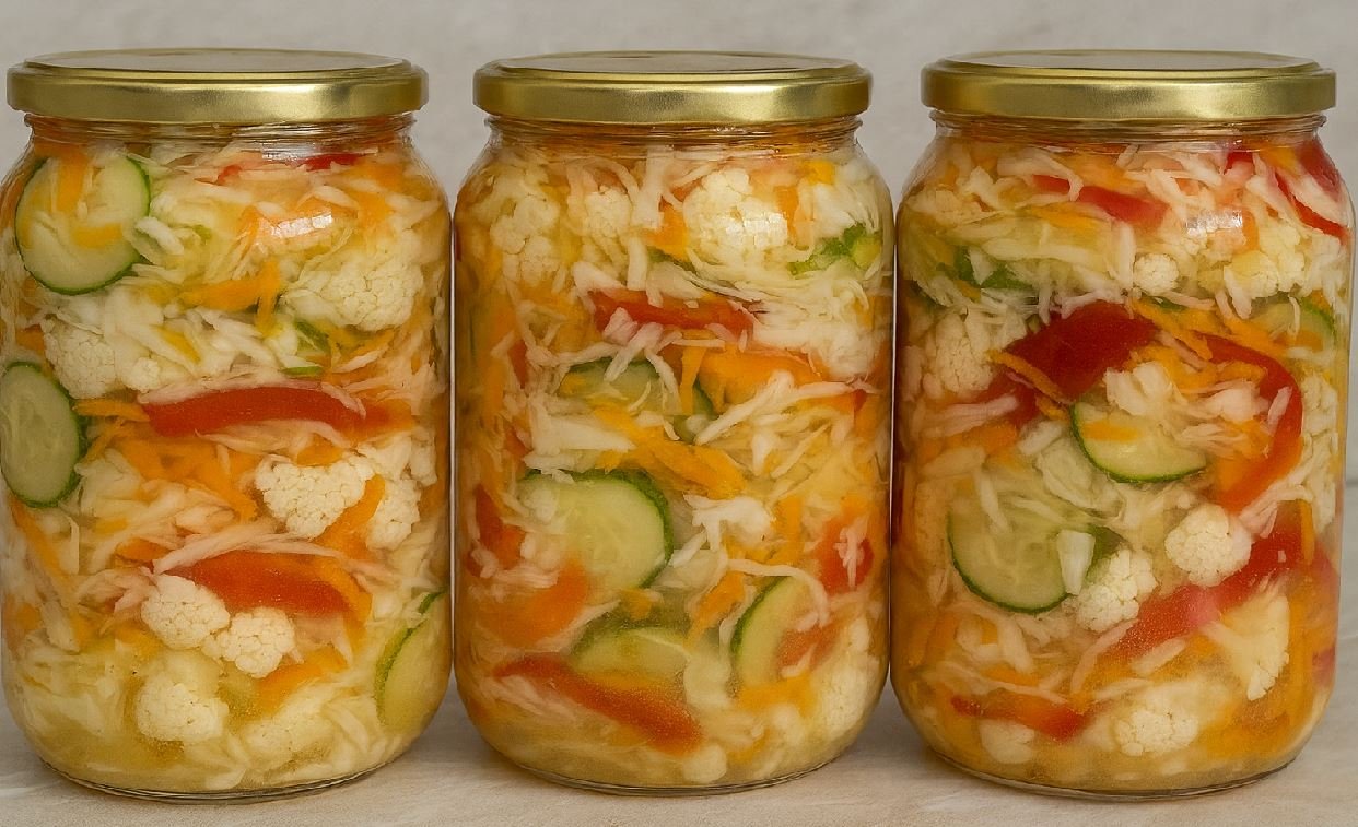 Ako voliš šarenilo na trpezi i domaću zimnicu, ovaj recept je idealan za tebe! Kombinacija kupusa, paprika, šargarepe i karfiola uAko voliš šarenilo na trpezi i domaću zimnicu, ovaj recept je idealan za tebe! Kombinacija kupusa, paprika, šargarepe i karfiola u savršeno izbalansiranoj marinadi daje neodoljivu salatu koja je uvek hrskava, osvežavajuća i odlična kao prilog uz svako jelo. Ova zimnica se jednostavno priprema i može da traje celu zimu. savršeno izbalansiranoj marinadi daje neodoljivu salatu koja je uvek hrskava, osvežavajuća i odlična kao prilog uz svako jelo. Ova zimnica se jednostavno priprema i može da traje celu zimu.